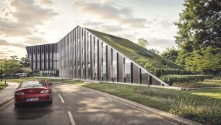 As described by project architects Scott Brownrigg, the curved three-storey building “will activate a sweeping bend at the main entrance to the site and feature a sloping green roof, helping to embed the structure within the landscape and enhance biodiversity onsite”.