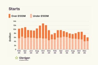 Project starts over the past three months have fallen by 31% compared to the preceding three months, with values slashed by 20% compared to 2025 figures.